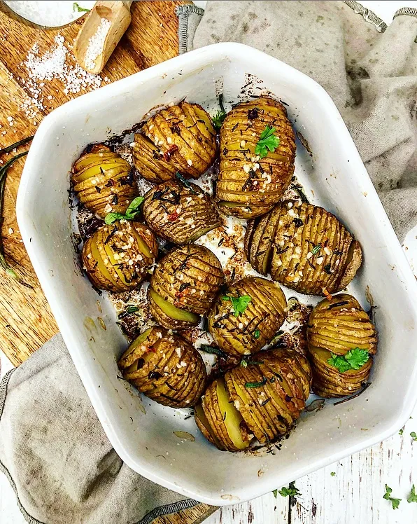 Hasselback kartofler stammer oprindeligt fra Sverige, hvor de blev serveret på den berømte restaurant Hasselbacken i Stockholm i midten af 1900-tallet. Siden da har de fundet vej til køkkener over hele verden – og med god grund. Kombinationen af den sprøde overflade og det bløde, cremede indre gør dem uimodståelige. I denne opskrift får klassikeren et aromatisk twist med hvidløg, rosmarin og timian, som løfter smagen og gør kartoflerne endnu mere alsidige. Det er netop den balance mellem det rustikke og det elegante, der gør hasselback kartofler perfekte både til hverdag og som tilbehør til festmåltider. Når smørret smelter ned i de tynde skiver under bagningen, karamelliserer overfladen og gør hver eneste mundfuld fyldt med smag. Enkle ingredienser, stort udbytte – det er hemmeligheden bag denne populære opskrift.