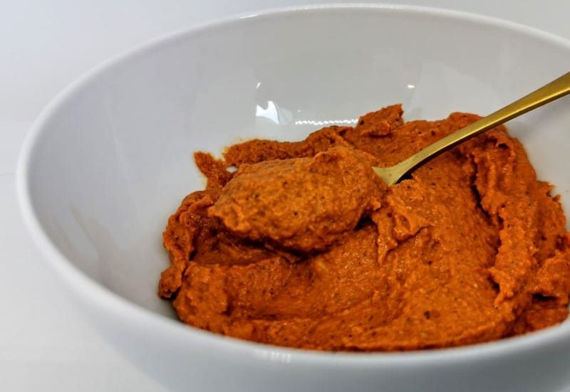 For at få den rette struktur skal peberfrugterne have skindsiden opad under bagning. Når skindet er sortnet, skrælles det forsigtigt af, så kun det møre kød bruges i saucen. Mandlerne tørristes separat på panden, så de frigiver deres naturlige olier og aroma. Når de tilsættes til blenderen, må der gerne være en smule tekstur tilbage. Romesco skal ikke være helt glat – lidt knas giver karakter. Olivenolie tilsættes til sidst for at samle saucen og give den en blød og rund finish. Citronsaft, salt og peber justeres efter smag. Det er en sauce, der både kan være cremet og rustik på samme tid. Konsistensen kan nemt justeres med lidt ekstra olie eller en smule vand, hvis den ønskes mere flydende.