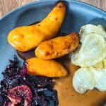 Selvom de minder om klassiske brunede kartofler, giver denne version en ekstra dimension, der gør dem oplagte til både and, flæskesteg og medister. Fløden tilføjer en let cremet note, der fungerer særligt godt sammen med fedme fra julesaucen og giver en harmonisk kontrast til salt kød. De kan desuden laves med alle små, faste kartofler, men aspargeskartofler fungerer bedst, fordi de holder formen og absorberer karamellen uden at gå i stykker. Den flotte blanke overflade gør dem til et visuelt højdepunkt på tallerkenen, og den afrundede smag passer perfekt til julens øvrige elementer. Hvis man vil forberede lidt på forhånd, kan kartoflerne koges og pilles tidligere på dagen, så man kun behøver at lave karamellen og glase dem lige inden servering. Det er også en opskrift, der fungerer ved større selskaber, fordi karamellen er mere stabil med fløde, hvilket gør risikoen for fejltagelser meget mindre. Når man først har prøvet denne version, virker de klassiske brunede kartofler næsten lidt tamme i sammenligning – og gæsterne bemærker forskellen med det samme.