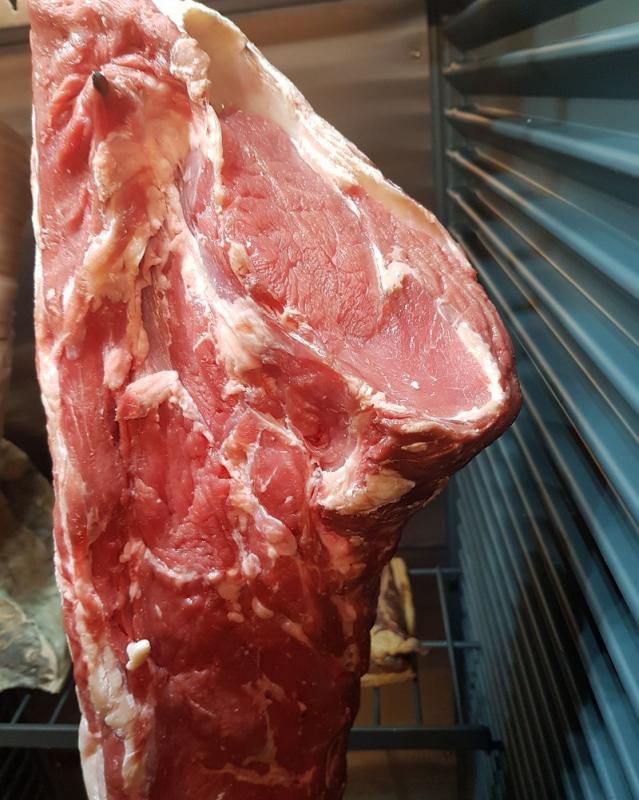 Kødet fik rettet sig fint ud og blev efter 10 dage taget ud af skabet. Her skar jeg cirka 1,5 kg fra og resten af kødet blev lagt tilbage i modningsskabet, så det kunne modne videre.