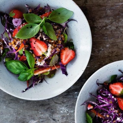 - Bland grøntsagerne med friske urter. Kom linser og feta over. Fordel olivenolie, æbleeddike og citronsaft over salaten. Drys med abrikos, nigella og salt. Pynt med jordbær. Spis hele portionen.