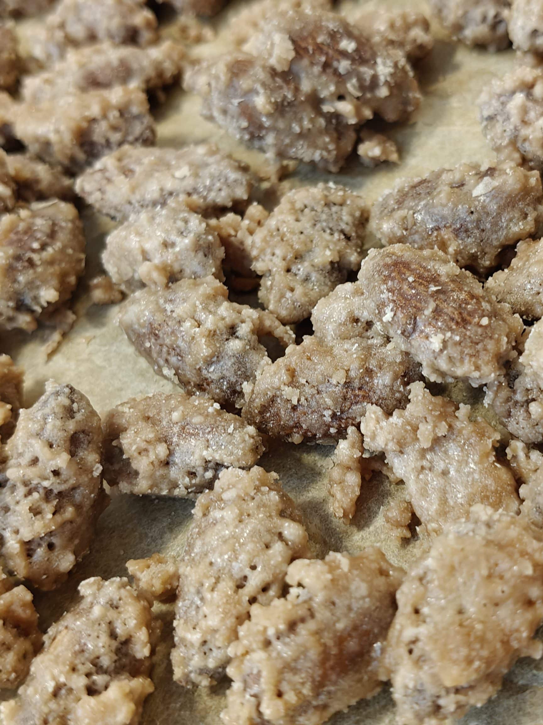 Hvis mandlerne klumper på bagepapiret, er de ikke blevet skilt ad med det samme. Hæld ud i et tyndere lag og skil dem straks næste gang.