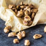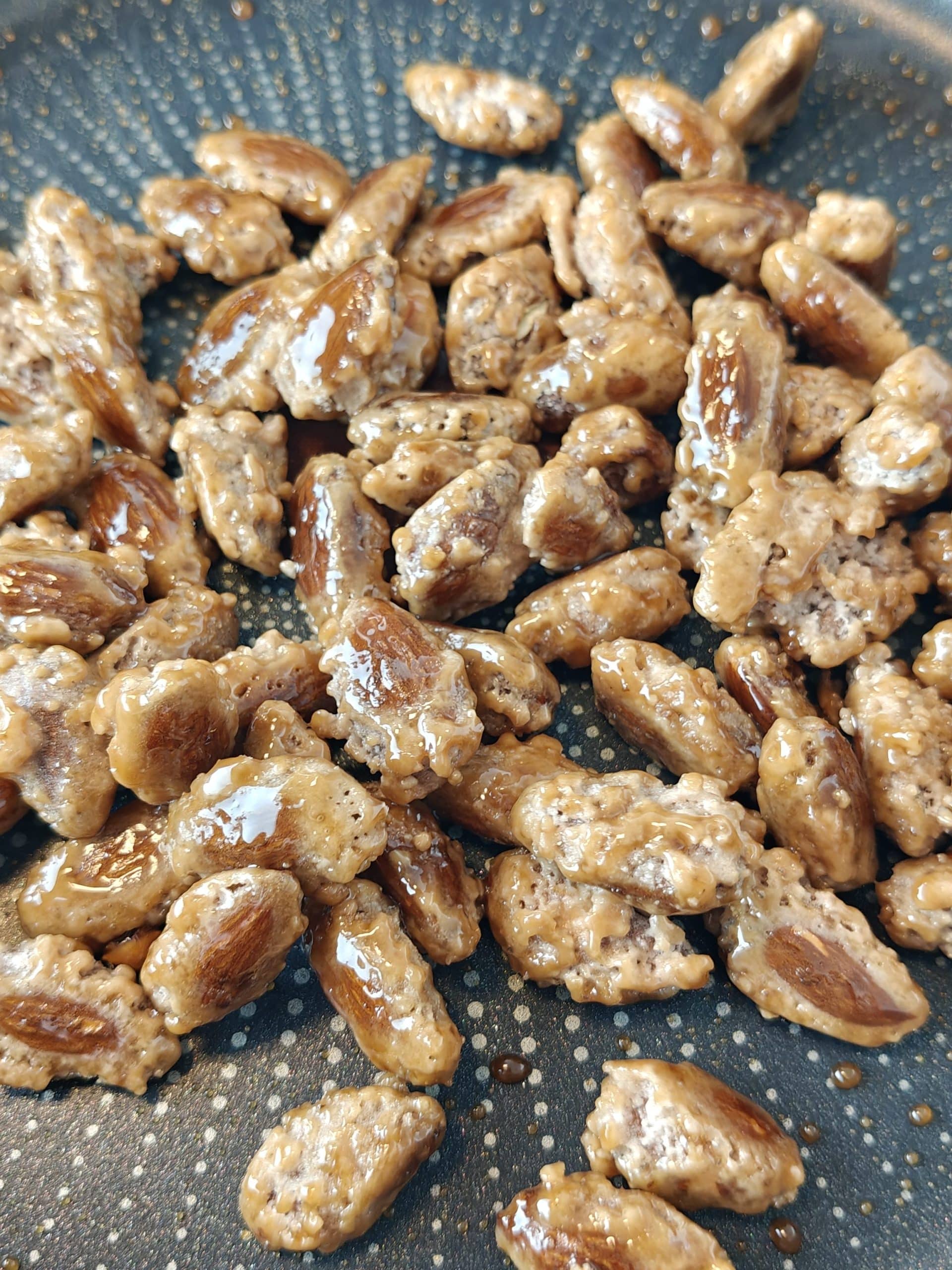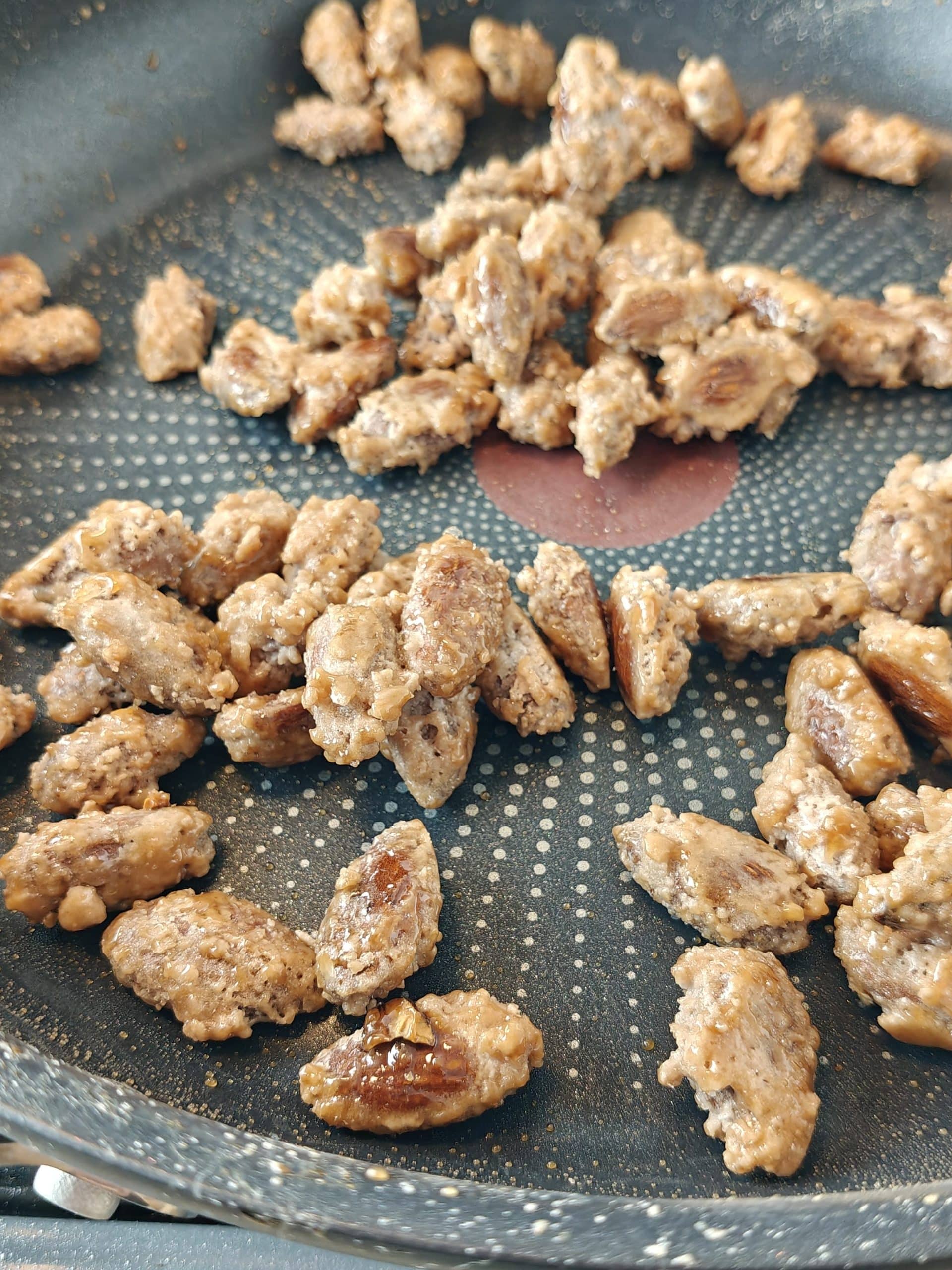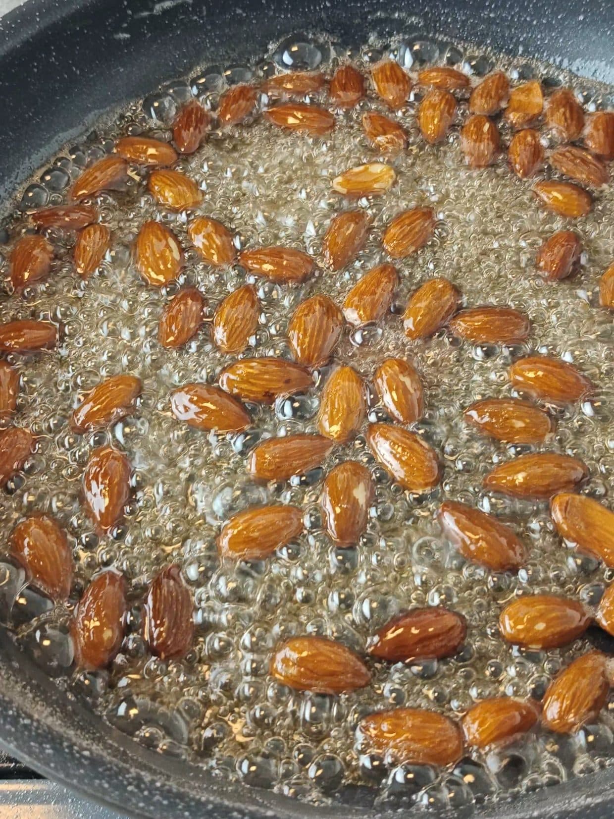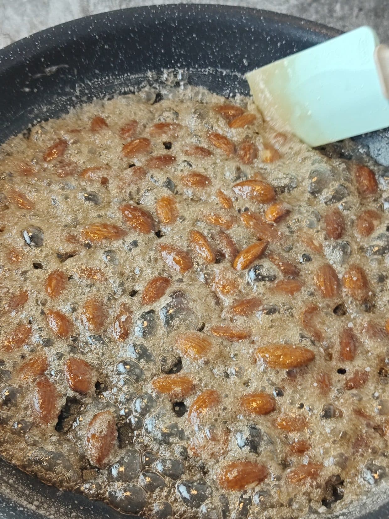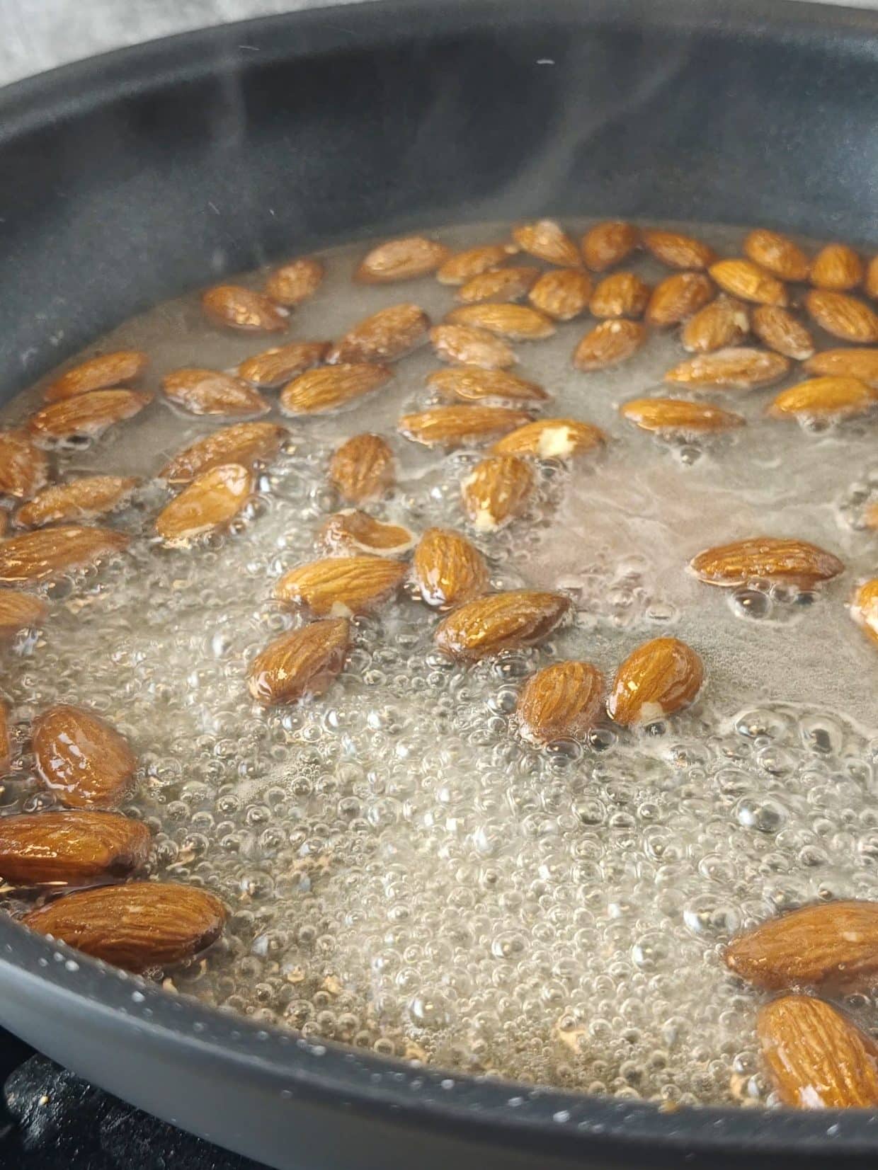 Bliv ved, til vandet er helt fordampet, og sukkeret skifter til en tør, hvid masse omkring mandlerne.
