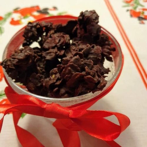 Der skulle selvfølgelig også laves helt traditionelle cornflakestoppe (sådan er det jo med jul – vi elsker vores traditioner!), så her får du min opskrift med en dejlig mørk chokolade. Du kan bruge lige den chokolade, du bedst kan lide.