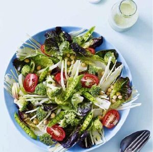 Dejlig opskrift på en fyldig salat, der bl.a. består af hjertesalat, ærteskud, broccoli, tomater og fennikel.
