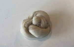 - Snor strimlen rundt om fingrene 2-3 gange. Afslut ved at tage strimlens anden ende mellem pege-og tommelfinger og over snoningerne. Tag fingrene til dig, så enden af dejen hæftes ind i dejen.