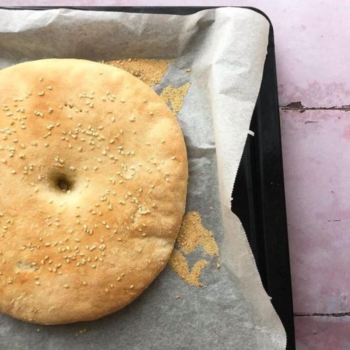 - Start med at blande mel, salt og sukker sammen i en skål. Lav en lille fordybning og smuldr dit gær i. Hæld vand i fordybningen og opløs gæren. Ælt dejen i et par minutter til den bliver glad og smidig - den må ikke være våd. Del dejen i 2 og læg til at hvile i cirka 15 minutter. Derefter tag en bageplade med bagepapir og semolina på bagepapiret. Tag dine 2 deje og form dem runde og lidt flade. Lad dem hæve i minimum 1 time. Pensl med vand og drys sesamfrø på. Bag i cirka 20 minutter ved 200 grader, alt efter hvor tykke dine brød er. De skal bages indtil de er gyldne og lyder hule når du slår på dem. ????