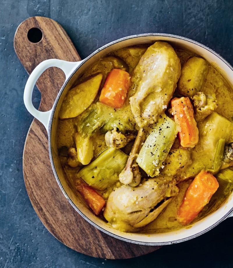 - Gør alle grøntsager i stand. Dvs. skræl/pil, skyl, og tør dem omhyggeligt. Tag løget og ¼ af grøntsagerne fra til kogning, og læg de resterende til side til senere. Skræl ingefærstykket, og skær ca. halvdelen i tynde skiver (resten rives i saucen senere). Stik nellikerne i løget, og læg det og de øvrige kogegrøntsager i en stor og rummelig gryde. Læg også ingefærskiverne og citrongræs i gryden. Læg kyllingestykkerne øverst, læg/pak dem så tæt som muligt, så de ikke fylder for meget i højden. Hæld vand ved, til det står 4-5 cm over. Bring langsomt kyllingestykkerne i kog, og skum omhyggeligt, når det koger. Tilsæt hvidløgsfed, laurbærblade, peberkorn samt salt og sukker. Læg låg på, og lad kyllingestykkerne koge meget blidt i 45-50 minutter, til de er møre. Tag gryden af blusset, løft forsigtigt kyllingestykkerne over på et fad. Kog suppen, indtil der er 10-12 dl væske. Si suppen over i en skål, og smid urterne ud. Skær de istandgjorte grøntsager i lidt grove stykker, og kog dem i vand med salt, til de er møre, men stadig har bid. Brug den gryde, kyllingen og suppen var i, så bliver den gjort lidt ”ren”, mens grøntsagerne koger. Læg grøntsagerne sammen med kyllingestykkerne. Gem 5-6 dl af grøntsagernes kogevand, og hæld resten ud. Tør gryden med køkkenrulle, kom smør og mel i den, og sæt den over lavt blus. Rør, og lad det bage godt sammen. Tilsæt karry samt evt. koriander og spidskommen efter et par minutter. Lad krydderierne riste med massen i ca. ¾ minut, og spæd så med den siede suppe. Lidt ad gangen, og rør i gryden hele tiden. Tilsæt mælk og fløde, når der ikke er mere suppe, og kog saucen godt igennem. Tilsæt grøntsagsvand, til konsistensen er passende (saucen må endelig ikke laves for tynd). Smag til med limesaft, fintrevet ingefær og måske lidt salt og/eller sukker, og lad saucen koge meget blidt i yderligere 4-5 minutter. Læg grøntsager og kylling i saucen, og bring forsigtigt retten på kogepunktet igen. Fordel karrykyllingen (kød, sauce og grøntsager) oven på de kogte ris i portionsbakkerne.