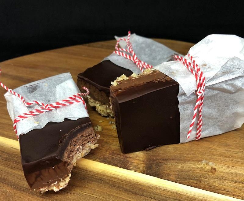 En sprød bund, med en godt lag nougatchokolade og toppet med et lækkert lag mørkt chokolade.