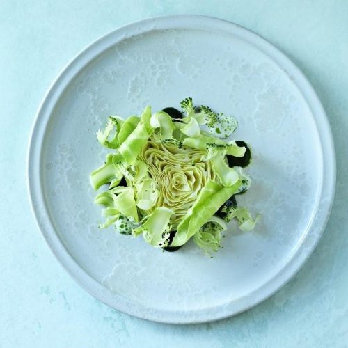 En lækker opskrift på saltbagt spidskål serveret med broccolicrudité, rå spidskål, spinatpuré og hvidvinssauce.
