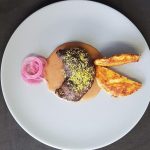 Serveret med syltede rødløg, rødvinssauce og gremolata