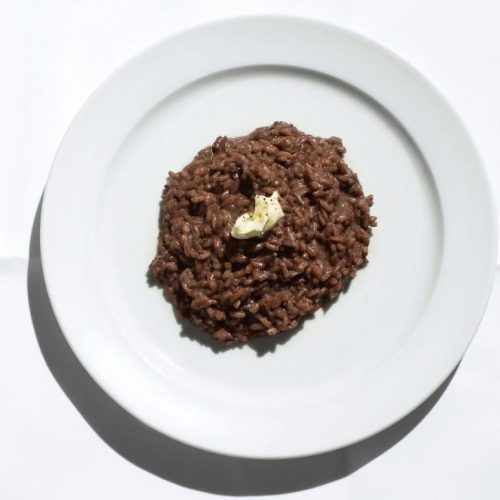 Risotto med amarone di Valpolicella – det lyder måske voldsomt, men man skal faktisk bruge 1 hel flaske amarone til risottoen her.